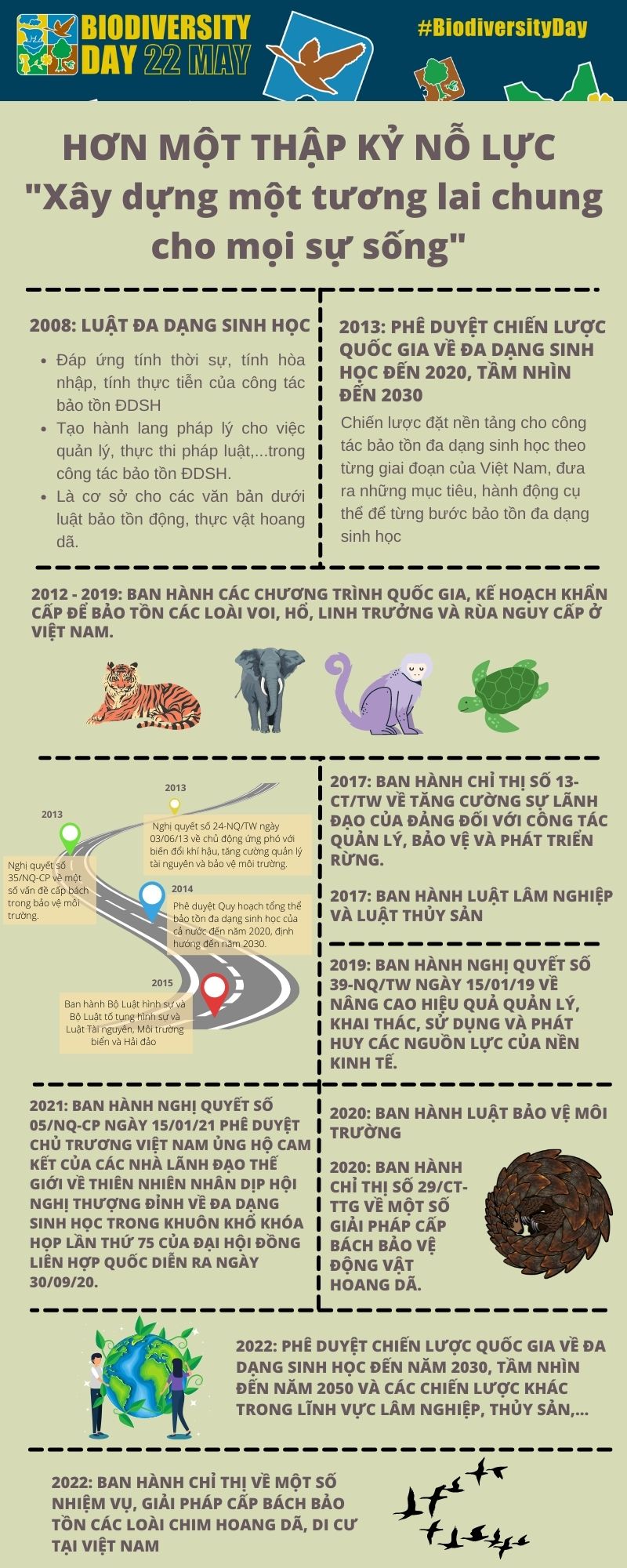 - 2022: Phê duyệt Chiến lược Quốc gia về Đa dạng Sinh học đến năm 2030, tầm nhìn đến năm 2050 : Cùng với các chiến lược khác trong lĩnh vực Lâm nghiệp, Thủy sản.